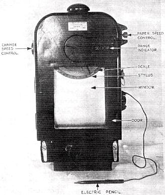 | Haida's equipment manifest from the 1940's indicates that a Model 761 echo sounding set was fitted on build. Its purpose was to measure water depth below the ship's keel. The 761 operates by transmitting a sound impulse that travels through the sea at a uniform speed. On reaching the sea bed, an echo is returned which is then measured and recorded on graph paper y. The interval of the received echo is proportional to the depth of the water. The recorder unit can still be seen on the starboard bulkhead of the Operations Room. (Image courtesy British Admiralty). |