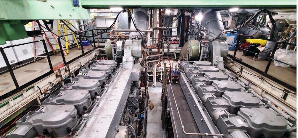 "The AOPV has four diesel-alternators sets coupled to two main high voltage 6,600 VAC switchboards for primary electric power generation. Each high voltage switchboard supplies 6,600VAC, 3-phase, 60 Hz power to one of two ship's service transformers, of which only one is required during normal operation to supply the full service electrical load.