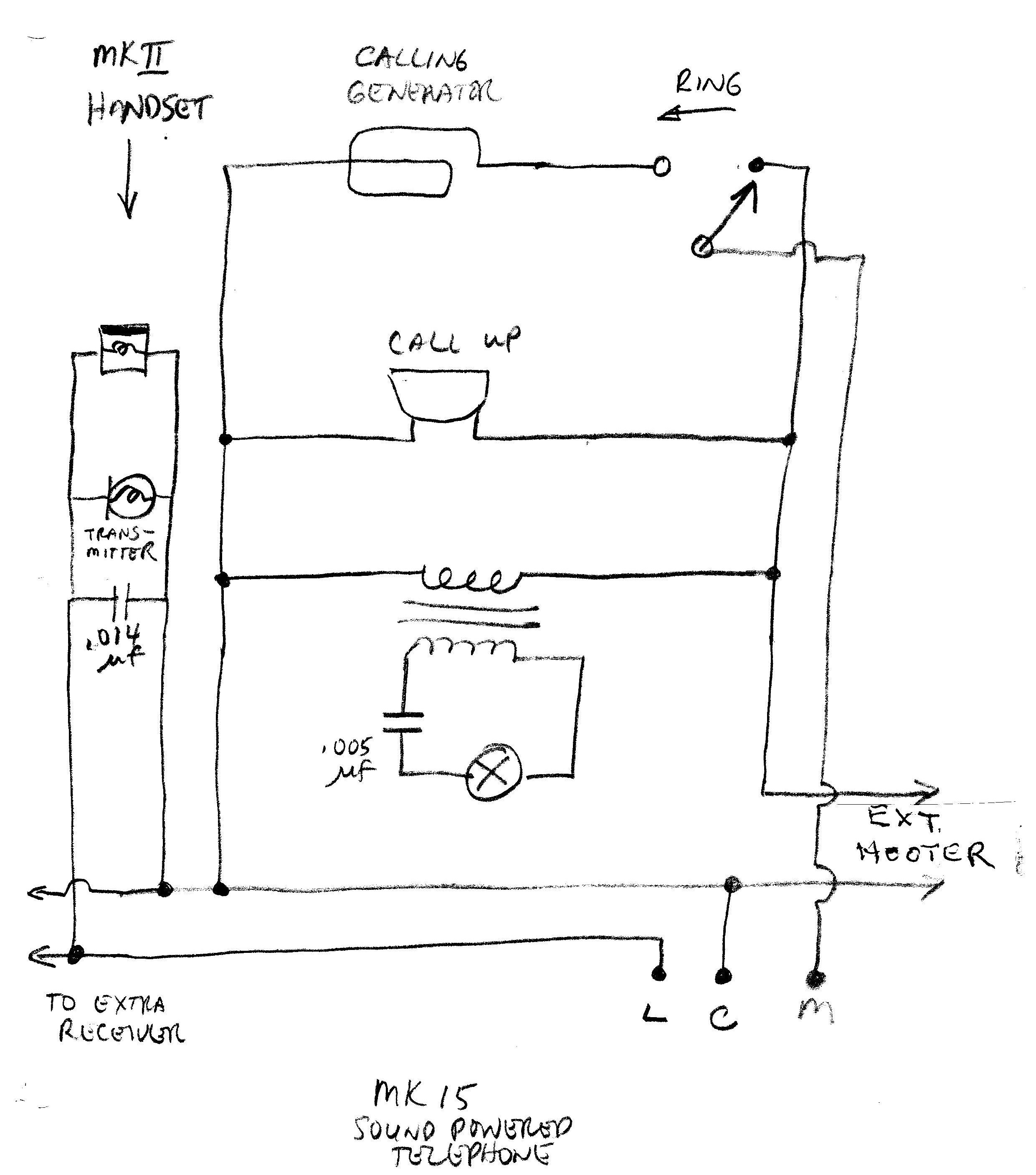 The actual efficiency of a sound powered link is about 25 db lower than that of a regular carbon microphone system. This limits the sound powered equipment to point-to-point applications and limited party line applications where the line loss does not exceed 15 db. Because of the resonant characteristics of the microphone and receiver units, the frequency response of the telephone falls off sharply for frequencies above 2000 Hz. There are two types of telephones installed on HAIDA. One type is the single line set and the other type is a selectable, six line unit. To originate a call on a single line set, the user turns the crank on the phone. This sends a ring voltage down the line which powers a buzzer and illuminates a neon lamp on the remote unit. The remote user than picks up the handset and communication can be established with the use of push-to-talk switches. Phones can be wired as party lines, so rotating the crank on one phone makes all of the other phones ring. By using ringing codes, only a certain phone will get answered. On a party line, the recipient of a call listens for the correct ringing code then selects the proper line with a rotary switch. The telephone system uses three wire, armoured cable for communication. White is common, black is voice, and red is ring. The photo illustrates a sound powered telephone in a badly deteriorated state. After 6 to 8 hours labour, the phones were restored back to their 1960's condition. (Photo by Jerry Proc) |
