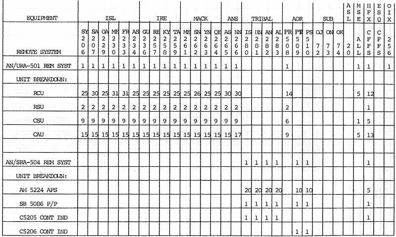 See Featured Equipment section.CSU Channel Switching Unit Supports up to 10 RCU's and 5 CAU's. A row of red and green lamps indicate receive/standby or transmit status of each of the 5 radio channels. Stock #5820-21-402-2004 CAU/AM-5143 Channel Amplifier Unit Vacuum tube version. Stock #5820-21-400-2004 CAU/AM-5143 Channel Amplifier Unit Solid state conversion with speech compression feature. Stock #5820-21-400-2004 AN/SRA-504 consisting of: Remote Control System AM 5224 Amplifier Power Supply See Featured Equipment section. SB 5086/SRA-504 Audio Patch Panel See Featured Equipment section and SRA-504 system description. C 5205/SRA-504 Control Indicator See Featured Equipment section. C 5206/SRD-504 Control Indicator For AOR Class. (Image courtesy RCN) C 5207 Control Radio Set See Featured Equipment section and SRA-504 system description. OJ 5002/SRA-504 Remote Operate Console See Featured Equipment section and SRA-504 system description. C 5208 Control PS See SRA-504 system description. MX 5128 MF Adapter Same function as HF adapter. MX 5129 HF Adapter See SRA-504 system description. MX 5130 VHF Adapter See SRA-504 system description. MX 5131/SRA-504 Adapter Control To Intercom See Featured Equipment section. J 5091 Jackbox See SRA-504 system description. PP 5200 Power Supply See SRA-504 system description. AM 5233 Audio Amplifier See SRA-504 system description. SAC Switch Assembly Converter See Featured Equipment section.