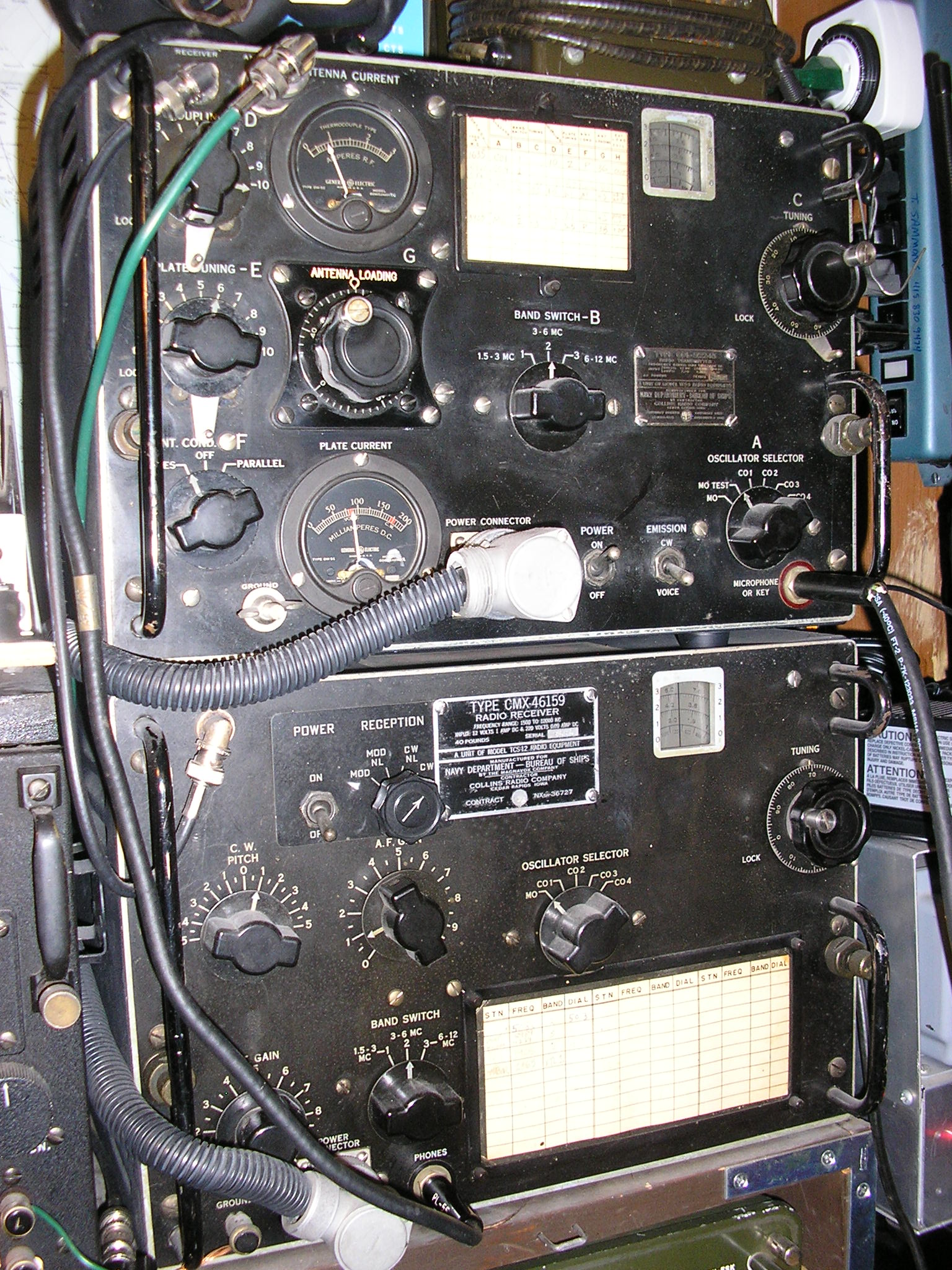 The data in the tables below was extracted from BR 299, a Royal Navy publication dated 1947. Photos and specs for some of this equipment can be found in this document including the specs for all 60 series transmitters . Any numeric suffixes which appear for American made equipment, denote the procurement contract number. A TBL-4 is identical to a TBL-12 but was made under a different contract number or even a different contractor.Sioux was in reserve from 1946 to 1950 so the radio fit for the year 1947 per BR299 might be a bit questionable. A discrepancy has already arisen from a 1945 radio office photo showing a Canadian Marconi CSR5 receiver. More detail in the photo caption. It is suspected that Sioux went into reserve status with most of her end-of-war equipment still fitted.