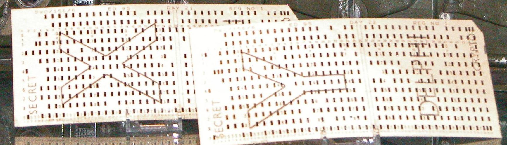 | To set the daily key, three IBM style (80 col x 12 rows) keycards ( marked X, Y and Z) were placed into three readers situated behind the module covers. Those key cards were used for a 24 hour period then destroyed. This was the first British crypto device to have the key encoded on punch cards. (Image via Royal Signaals Museum) |