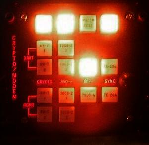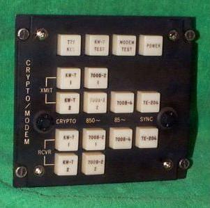 Photo by <logandad@gte.net> <Photo by logandad@gte.net> This is the cockpit remote control unit which could operate the KW-7. It was made by Collins. The Orestes system, used in strategic and tactical environments, was not limited to ships and land based systems but also used in aircraft. The panel has 16 Clare Pendar switches: they are a combination of DPST, 4PST, latching, momentary and all are illuminated. Face plate is backlit as evidenced in the right photo. Switches have the following labels, TTY / KEY, KW-7, MODEM TEST, POWER, KW-7, 700B-2 1, KW-7 2, 700B-2 2, 700B-4, TE-204, KW-7 1, 700B-2 1, 700B-4, TE-204, KW-7 2 .