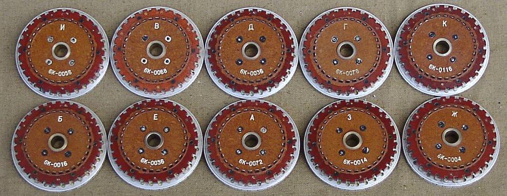 Later model Fialka rotor set (Czech Army). The male contacts appear to be spring-loaded stamped steel and are not round, like the orginals. Click to enlarge (Photo and copy via E-bay) |