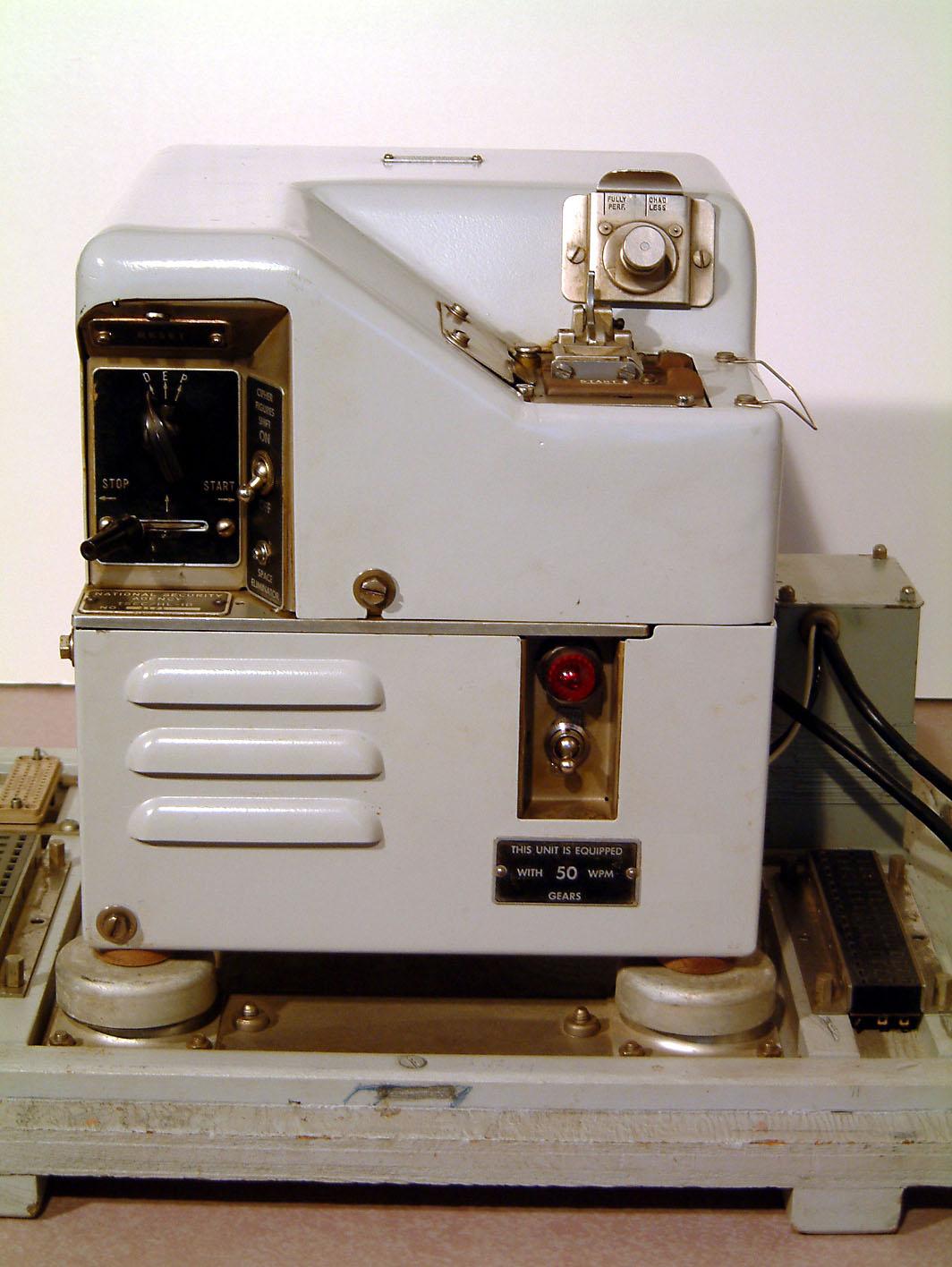 The round item above the tape reader assembly was a tape notching device. An operator could place the last character of a message on an index mark in this device, push the round button and "notch" the tape edge. The sensing of the notch would make the reader stop on "end of message".