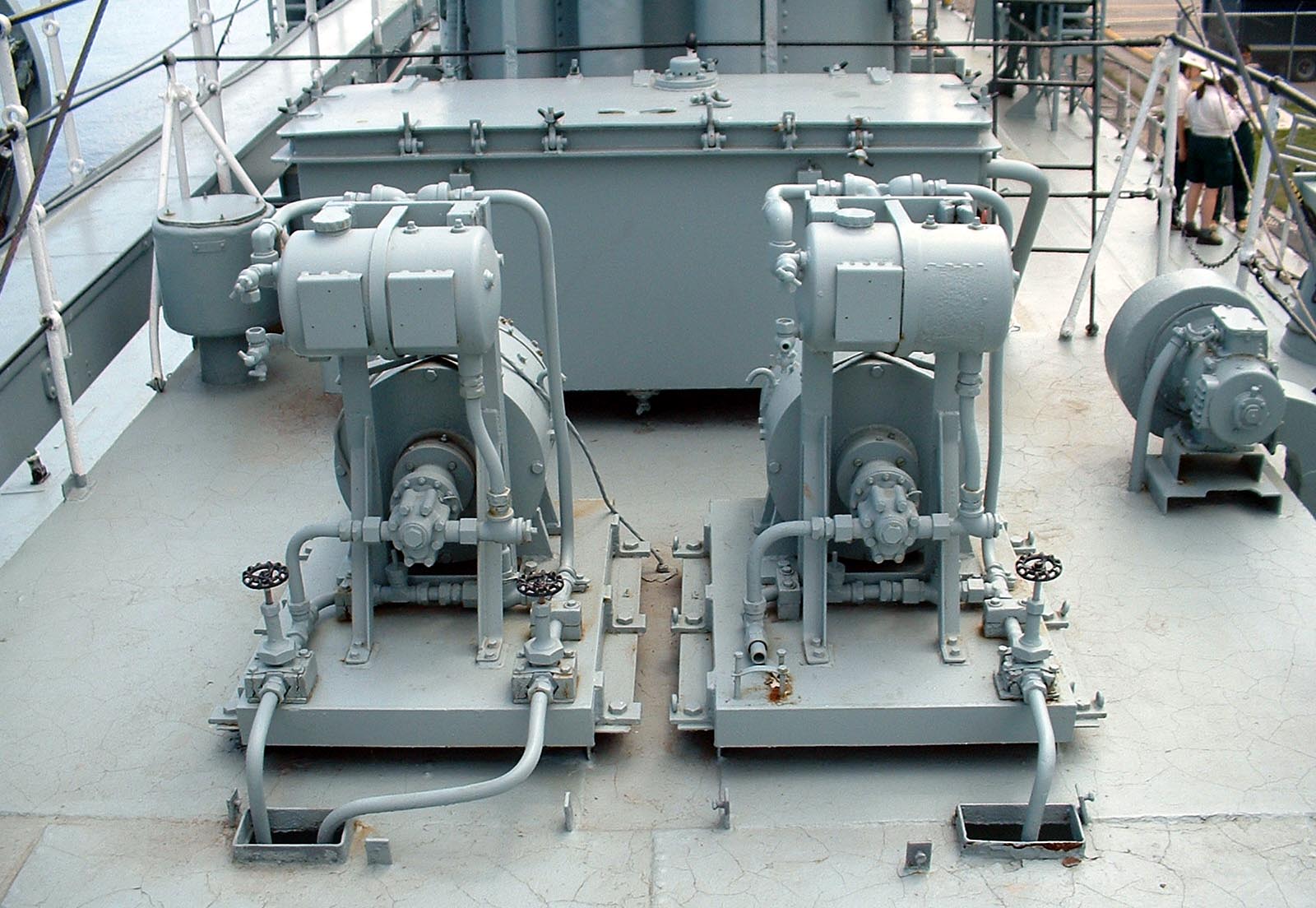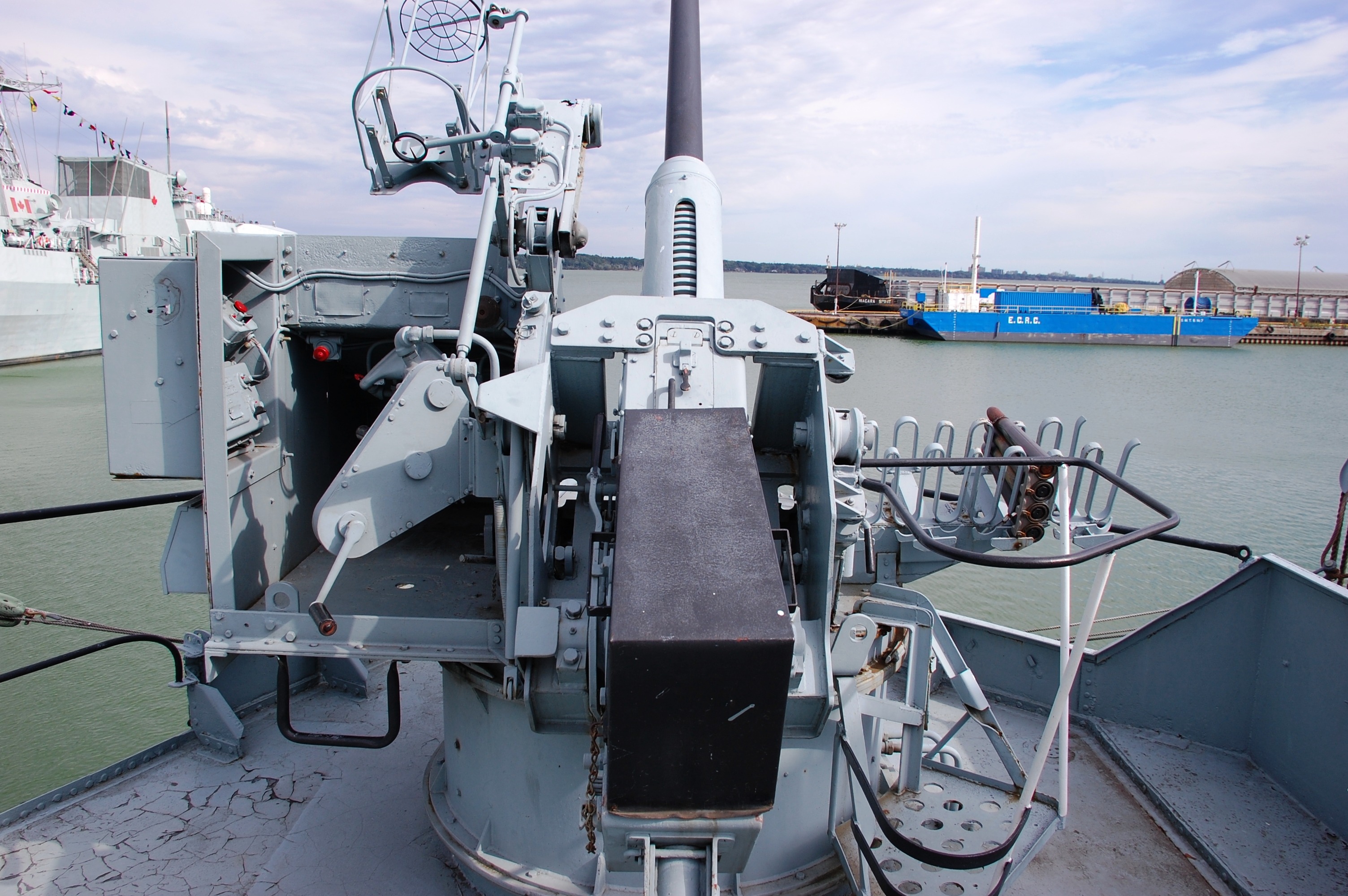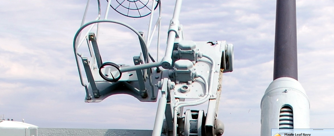The Bofors 40 mm gun, is an anti-aircraft cannon designed in the 1930s by the Swedish arms manufacturer AB Bofors. It was one of the most popular medium-weight anti-aircraft systems during World War II and used by most of the western Allies as well as some captured systems being used by the Axis powers. A small number of these weapons saw action as late as the Persian Gulf War.These 40 mm, Bofors anti aircraft guns were installed bertween 1946 and 1947, on top of the original twin 20 mm OERLIKON power mountings. This was an RCN innovation. The mounting operated hydraulically, with the fluid being supplied by the pumps forward of the after funnel on the Bofor deck, and aft of the helm at the Emergency Steering position. The mounting moved in response to the movement of the fire control "joystick". These guns used to have a Mark II Gun sight, but they are missing.