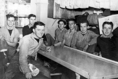 Pictured are seven crewmen in an eight men mess. The photo was taken aboard HMCS NOOTKA on November 20, 1947 and was typical of a mess deck in a Tribal.