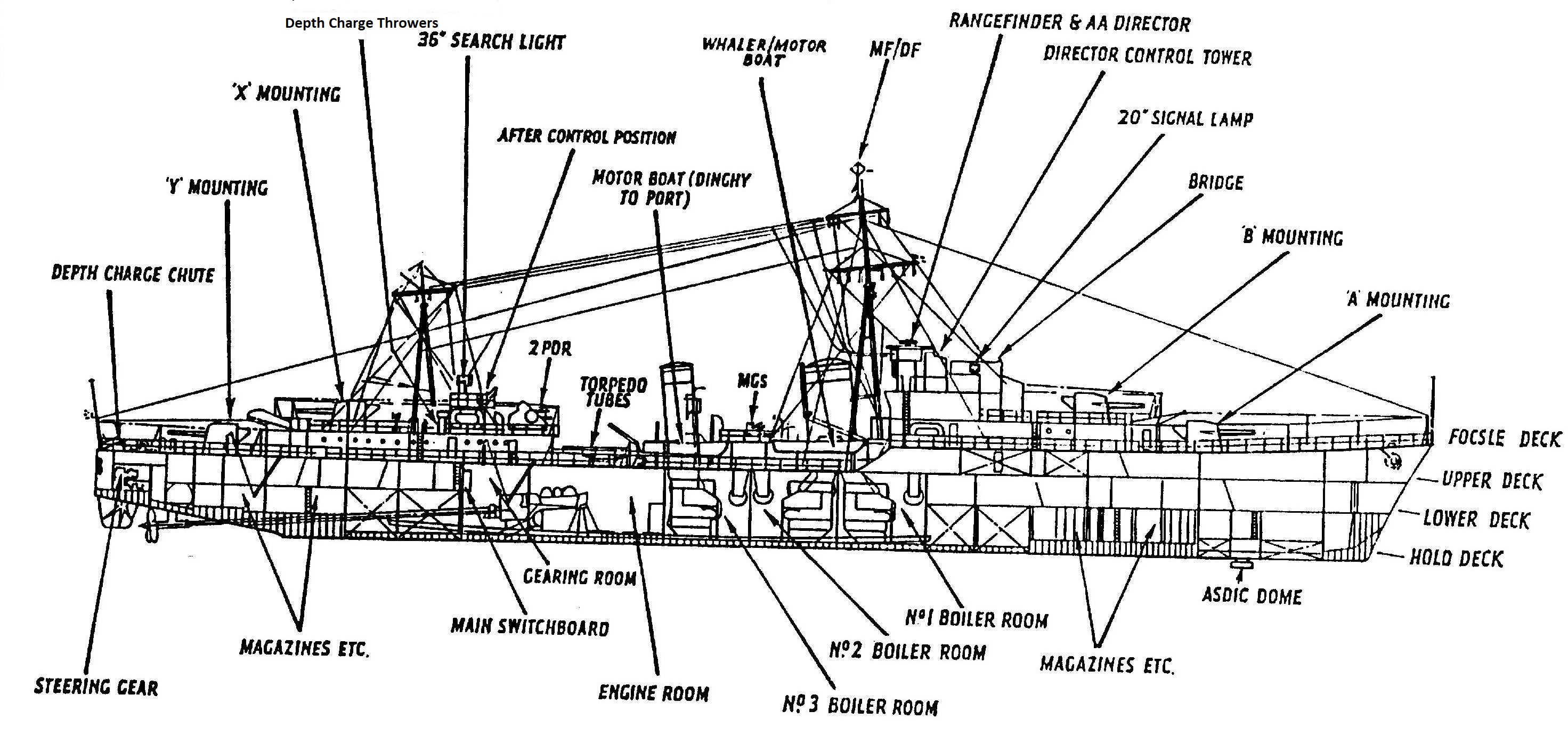Abaft the torpedo tubes and torpedo crane, the after superstructure contained the engineers' workshop, sick-bay, CO's pantry, his day cabin, sleeping cabin and bathroom. Above these ompartments were the after pompom position, the searchlight and after conning position. two nests of Carley floats and two depth charge throwers. The tripod mainmast carried a yard, a gaff and a Jacob's ladder. 'X' mounting's blast screen was fitted with a fog light. Right aft on the upper deck, was 'Y' mounting and the depth-charge chutes. Gangways were stowed here (for rigging aft or amidships) and there was an ensign staff.