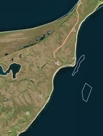 | The three tri-wing symbols indicate the locations of the aerial masts.on Karaginski Island. The circle within a circle near the bottom left is the location of the lighthouse (Image via Wikimapia) |