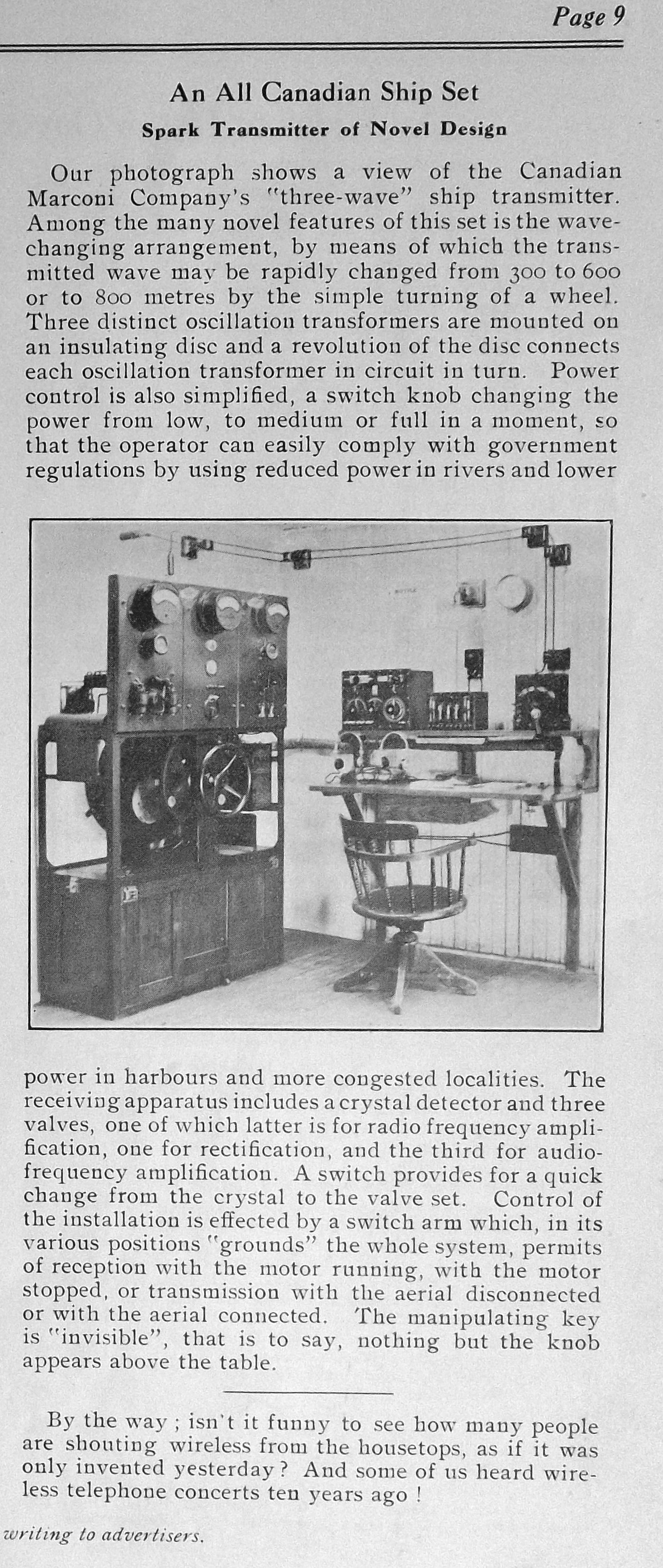 The Canadian Wireless article said that this transmitter was new when, in fact, it was already obsolete in 1922. Tube transmitters transmitted twice as far and with a much narrower band width. By international agreement, spark transmission was to be outlawed starting in 1930 but the transition from spark spanned several years.