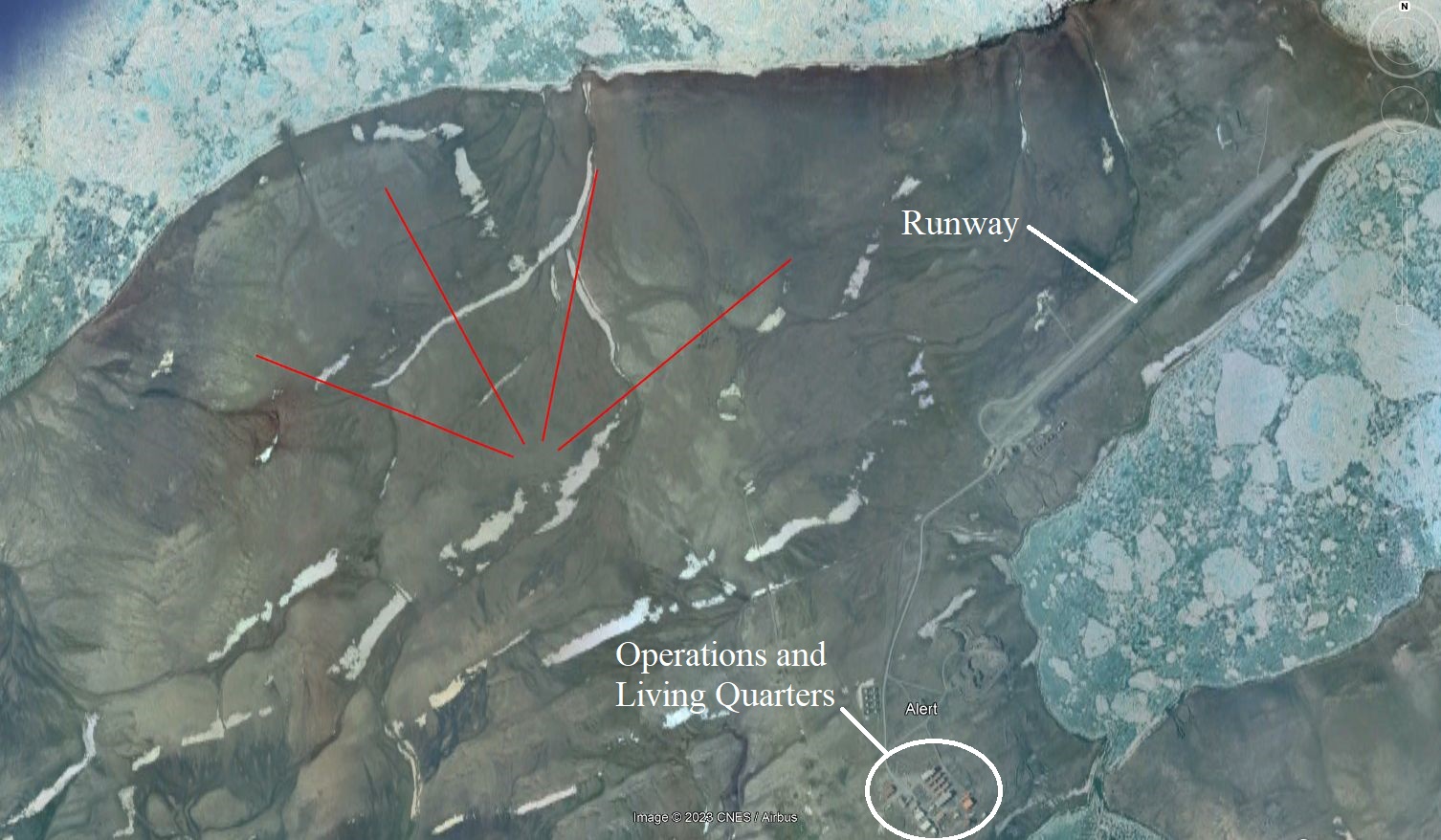 This aerial photo, taken in the Spring of 1989, shows the access road and electrical cable right of way to the Pusher site which is the little dot on the horizon. Because of the Pusher's distance from Polaris Hall (Ops Building), its presence is usually not noted by visitors to Alert. (Photo by Marcel Pepin. From the collection of Bill Robinson) |