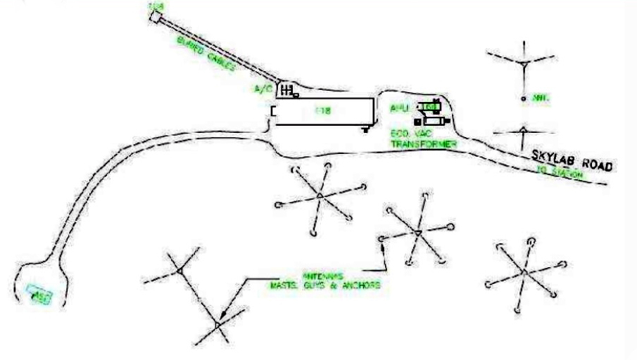 A small shelter houses the goniometer and support electronics of the AN/FRD-13 Pusher antenna made by Plessey. Here , the low angle of the sun casts a very long shadow. A description of what may be found at a Pusher site is described in the photo below. Easily seen above, is the access road and the electrical right-of-way. (Image courtesy Google Earth) |