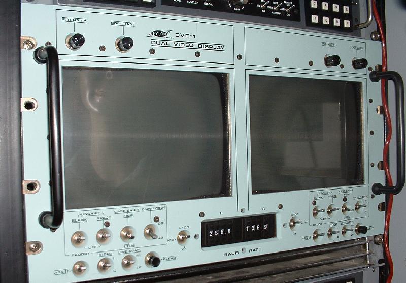 This display, at the Communications and Electronics Museum in Kingston Ontario, depicts a Dual Intercept position at a SUPRAD station typically from the 1980-1990 period. Both the Dual and Single Intercept positions were still in use at all SUPRAD stations, and particularly CFS Alert, until around 1994/5. Normally there would be a desk and chair provided in this position but due to space limitations they have been omitted from the display. A hook for the red handset was not provided in the display. (Photo by Jerry Proc) |