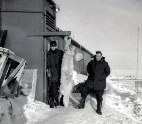 Hanging on the end of the beam is a dead wolf. Jim Thorenson explains. "In Alert, we had several Husky dogs. Arctic wolves frequented the camp. Every so often they would get real hungry, stray into our camp and tried to kill our dogs. There were also occasions where our members exited buildings only to be confronted by the wolves. Permission was obtained to “thin” the wolves out a bit and David Smith and I were granted permission to go out and hunt and kill some of them. Since were issued FNC1 rifles for our camp defence, we used them and I was able to shoot two of them. The one shown in the photo above was one of them. |