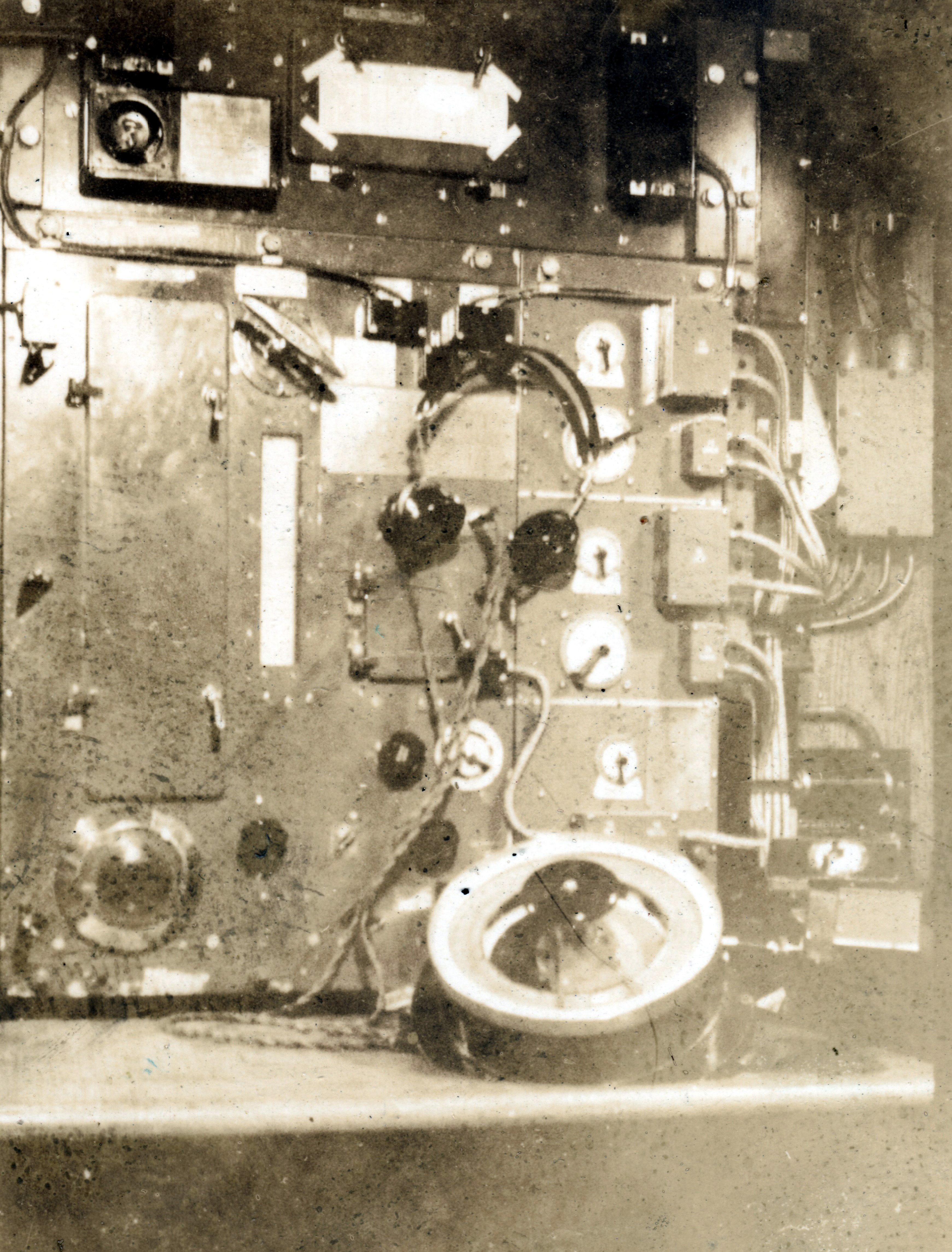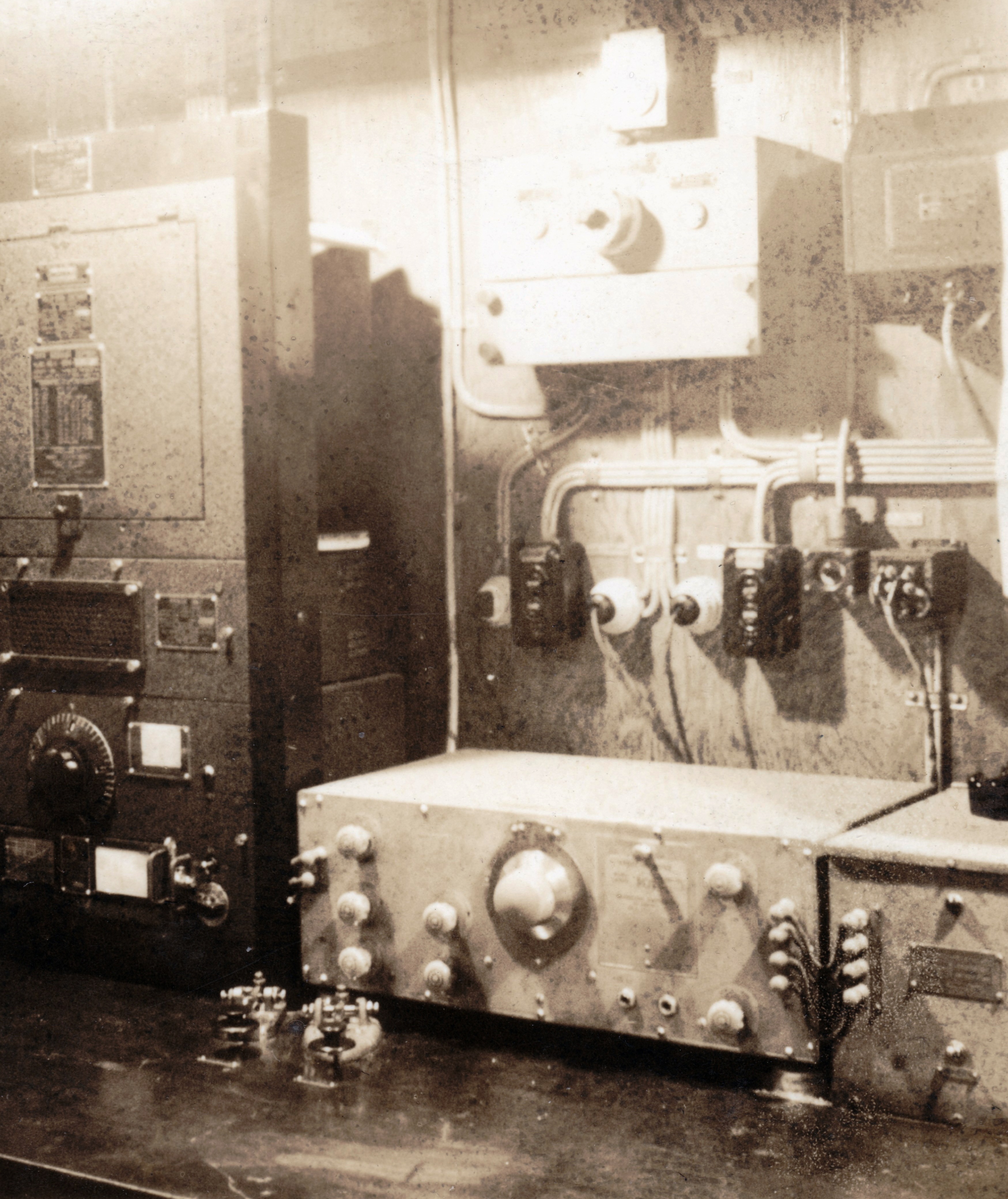 1950: A portion of the radio room aboard RCMP IRVINE, a former minesweeper HMCS Noranda) From left to right: Canadian Marconi FR12, CSR5 and MSL5. The CSR5 was last tuning a station around 475 kc/s. Note the knife switches on the battery charging panel at the right side of the photo. (Photo courtesy of Staff Sergeant Ben Colp, R.C.M.P. Marine Division submitted by Spud Roscoe)