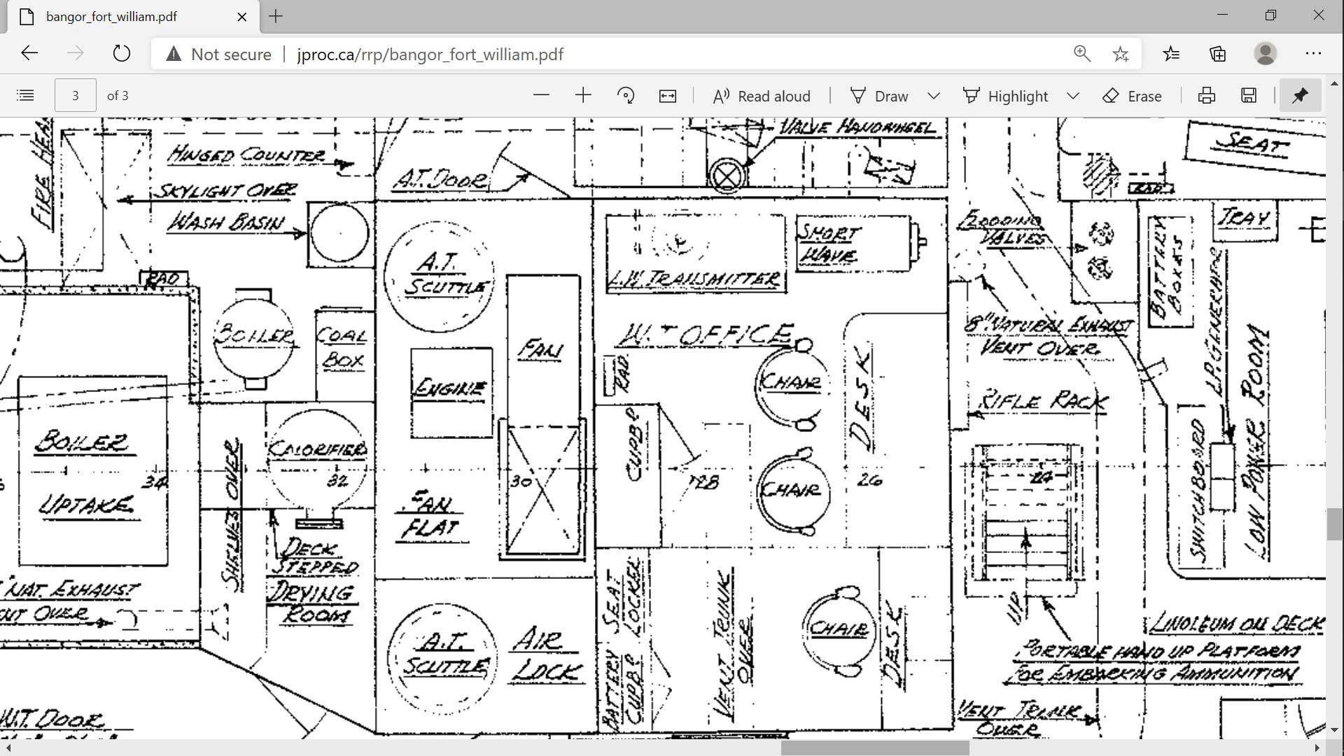This is a deck plan for HMCS Fort William circa 1939. It shows the position of the W/T office in the side view and the RDF (Radar) office in the top view. Click on thumbnail to enlarge. (Drawing courtesy Historical Naval Ships Association) From a deck plan enlargement this is the layout of the radio office aboard the Fort William. a Bangor class vessel. Click on image to enlarge. The receivers used in this installation are not shown. A sliding door, situated at the bottom centre of the drawing, provided access to the radio office. The dimensions of the Bangor WT Office are 12 feet by 8 feet This was determined by comparing the known dimension of a table in the C.R.O.'s Mess The width of the operating desk is approximately 9.5 feet or 114 inches. Here are the widths of the various pieces of equipment which might have been on the desk: