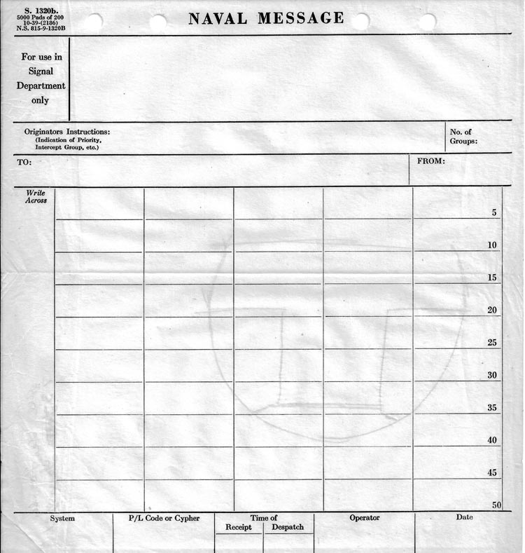 Using a pencil, the operator would copy broadcast messages from shore authorities onto a naval message form, which, in the short form, consisted of 50 blocks or 100 blocks in the longer form. At the top of the form, the operator entered the coded, lettered address delivery groups while into the blocks went four figured cipher groups. At the bottom were spaces for logging the time of receipt, the operator's name, the frequency and other particulars. Without a doubt, the broadcast operator was kept fairly busy filling in these forms, especially with long messages pertaining to convoy dispositions an U-boat situation reports.