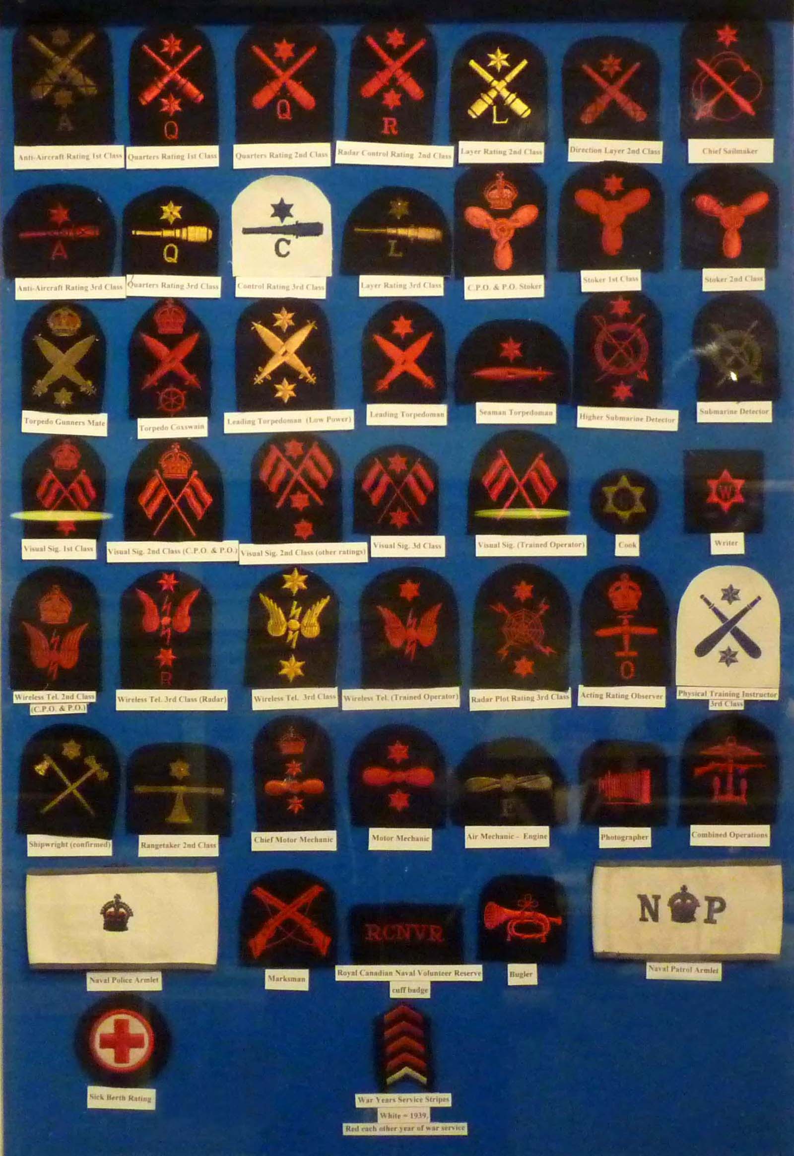 WWII trade badges on display at the Naval Museum of Alberta . Click to enlarge. (Photo by Jim Silvester, Mill Bay, B.C.) |