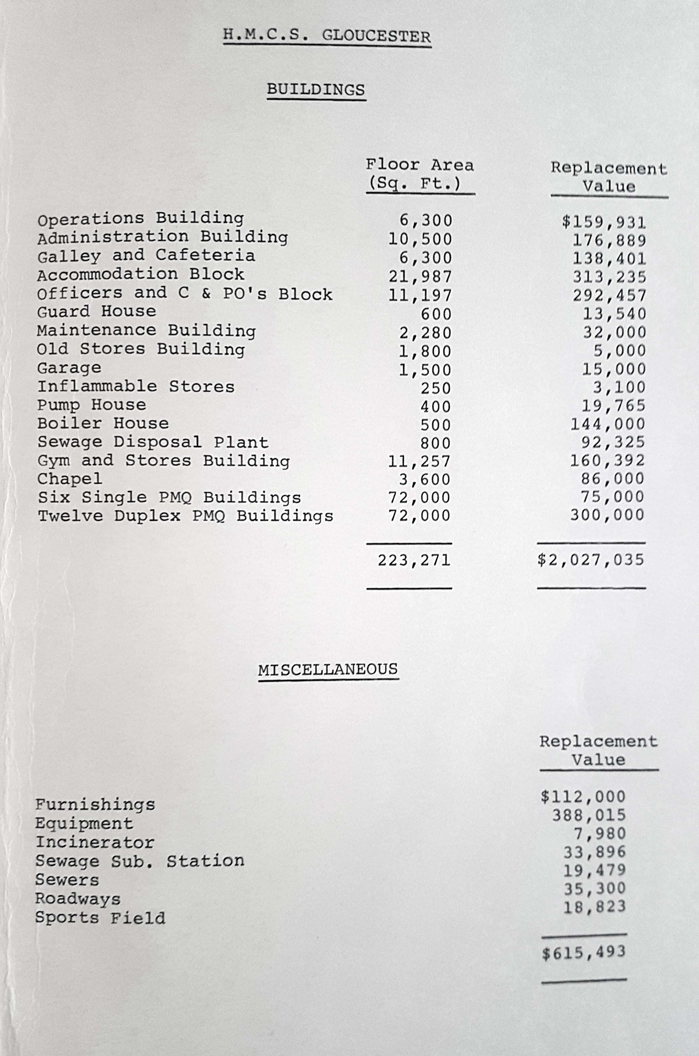 All buildings in Gloucester except the Married Quarters were connected to a control fire alarm system either by manual or heat activated alarm switches. The major fire fighting equipment consisted of a fire hydrant system with a jeep and pumper to increase the water pressure for multiple hose use. The pumper was capable of delivering 350 gallons per minute.