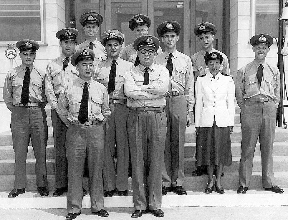 Back row: (L-R) Ken Dorush, unknown, Roger Philon , unknown, Bruce Pirt Middle row: (L-R) Archie Reid, Ron Hume, Jack Crowston. Remainder of row unknown. Front row: (L-R) Unknown, D.S.K.Blackmore, Ted (Kipper) Burke (Photo submitted by Donna Loewen. From the collection of D.S.K. Blackmore) |