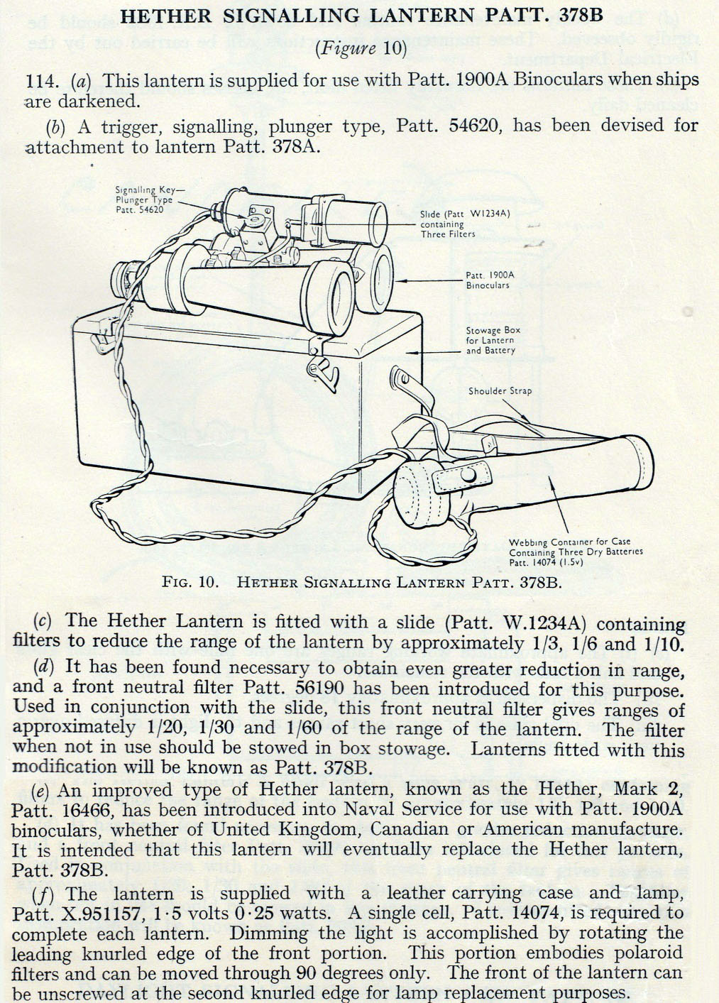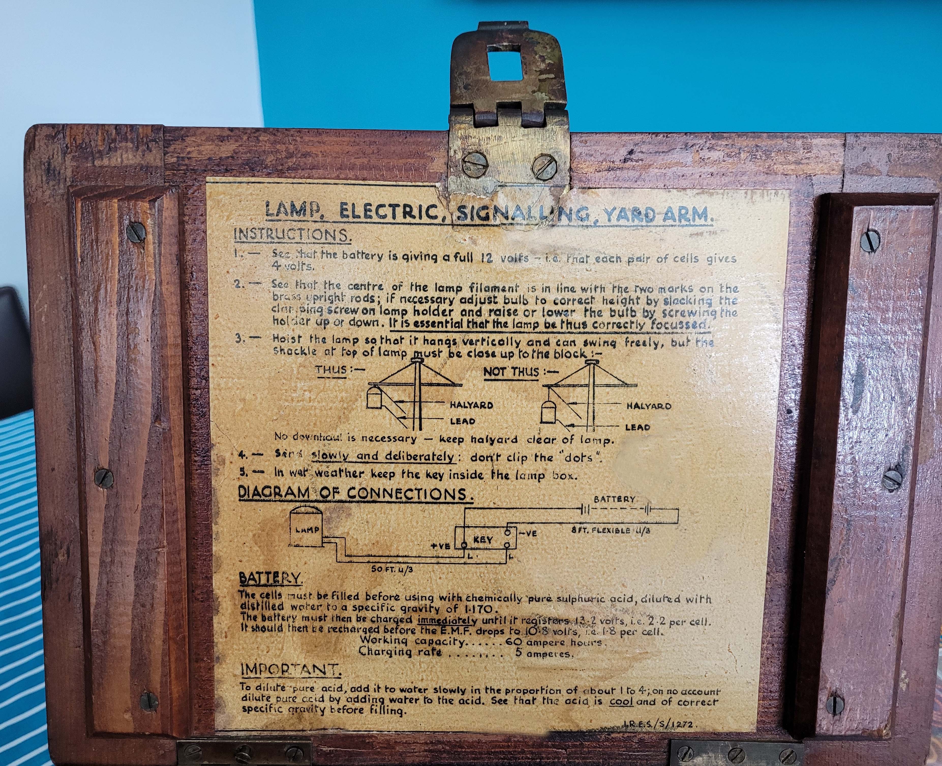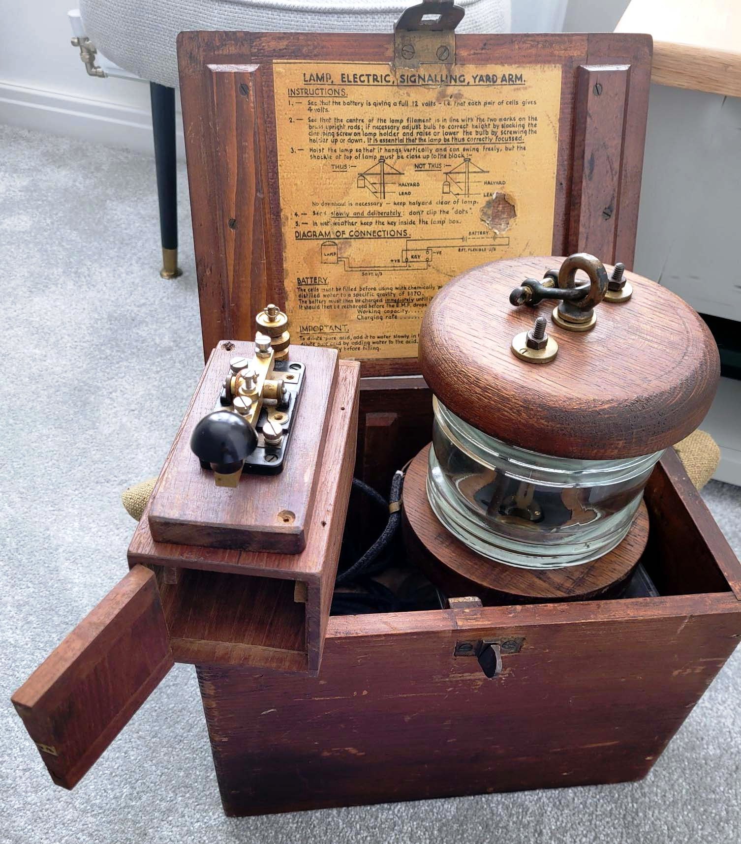 This device uses an Edison Mazda 1W 2V bulb, Patt 1039A and powered by a rechargeable battery in a box slung beneath the instrument. It was smaller than the Aldis Lamp and used for night-time convoy identification, hence the reason for using a low power (1 watt) bulb. Internally, it has sockets for 2 bulbs (one to hold a spare). The operator can select one of five coloured lenses – blue,/ red, green, white or clear. In the RCN, it was used at close quarters but night time only.