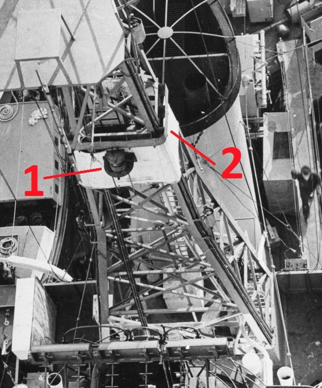 Nameplate data: Pattern 3860A; Serial 5676; Year: 1944; Made by: General Electric, Toronto. It is not known if this particular projector was original to the ship since there was little chance that Vickers-Armstrong (HAIDA's builder) would use an overseas subcontractor during wartime. A 1944 date might suggest that the projector was replaced during a 1944 Canadian refit or even later. |