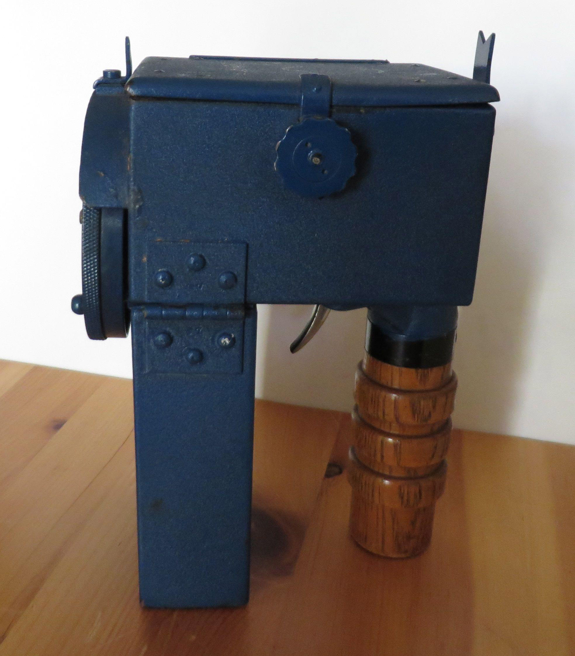 The pistol grip is fitted with two triggers. The lower trigger turns on the lamp and must remain depressed for the duration of the message while the upper trigger tilts the mirror. When the lantern is accurately trained on the receiving station and even if the lamp is on, nothing will be seen until the beam is raised by pressing the upper trigger. Releasing the upper trigger drops the beam thus producing breaks between the dots and dashes of the Morse code characters. During darkness, colored filters could be attached to the lantern to reduce the lamp's brilliance.