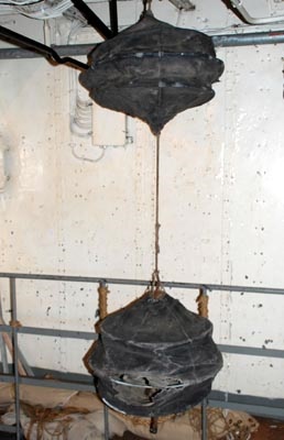 This is a canvas black ball, the type used by the RCN in the 1960's. This example aboard HMCS HAIDA is in a near petrified state after having been stored outdoors for several decades until it was discovered in 2002. Handled with care for the photo shoot, it was not forced to deploy to its fully open position. Normally the top would be peaked like the bottom. (Photo by Jerry Proc) Here's how two black balls looked when secured with regulation length tackline. The bottom one is in a fairly deteriorated state. (Photo by Jerry Proc)