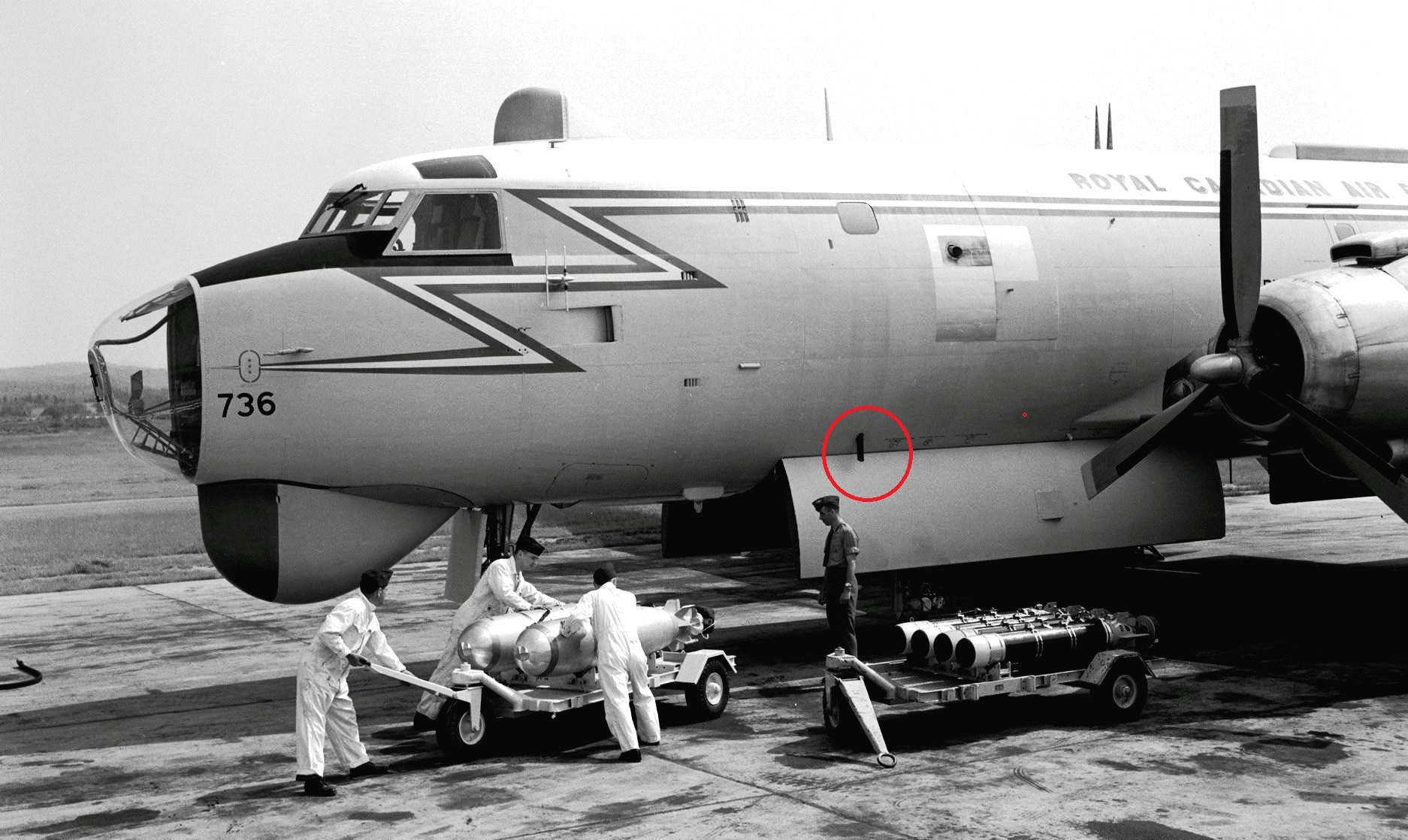 | AN/APN-501 | Doppler radar. Circa 1958. Made by Canadian Marconi. The Doppler radar was mounted under the a/c and depending on the model, it had three or four beams pointed downwards and outwards. By comparing the beams the operator could determine track, drift angle and ground speed. (Canadian Forces photo of the Doppler antenna) |