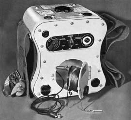 | AN/CRT-3 | "Gibson Girl" Emergency Radio. Transmits on 500 KHz and 8364 KHz. Use of the Gibson Girl enabled rescue crews to locate survivors of ship or aircraft emergencies. The CRT-3 and its accessories were bright yellow-orange in color and the unit would float if placed in the water. It was also packaged with a parachute so it could be dropped to survivors in the water. The Gibson Girl is operated by holding it between the knees while cranking the internal generator by hand. It can be set to automatically transmit an SOS signal or manual keying can be used to send a message. (Photo courtesy Olive Drab Electronics) |