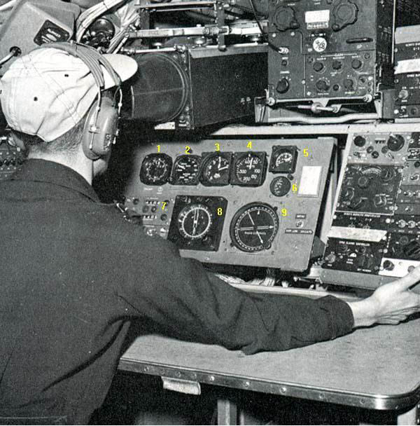 The instrument cluster : 1) TACAN, 2) Radio Altimeter, 3) Barometric Altimeter, 4) Air Speed Indicator, 5) Clock, 6) Outside Air Temperature Gauge, 7) Lat/Long Counters and L/L update buttons, 8) Master Director Corrector (main ANTAC compass) and 9) ADF/OTPI Indicator. There used to be an old joke in the navigation business. "By definition, a navigator is always lost. By the time he figures out where he is, he has already been there". |
