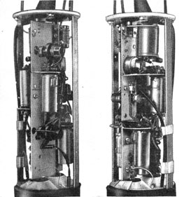 The AN/CRT-1A transmitter is mounted on a single rectangular plate, with the audio amplifier and the reactance tube on one side and the RF circuit on the other. The mounting provides compactness and improved isolation between the AF and RF circuits. The bottom of the housing terminates in a cast-metal ring, which aids in stabilizing the buoy in the water and which provides a mounting for the hydrophone release mechanism. This mechanism consists of a spring arrangement, which holds the hydrophone firmly in place during shipping and handling but which automatically triggers on impact with the water and permits the hydrophone to drop to the limit of its 24-foot cable